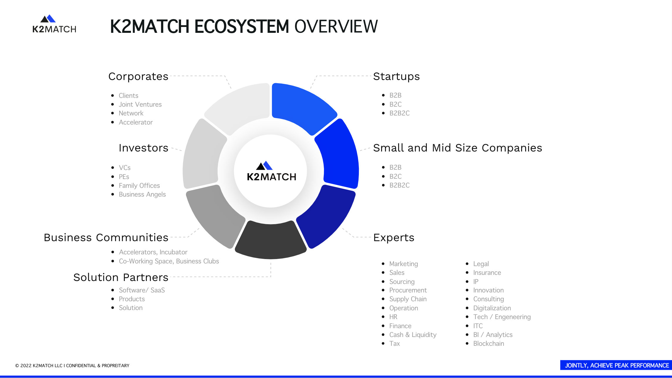 K2MATCH is an ecosystem of curated Startups, SMEs, VCs & PEs , Corporates, Experts, Business Communities & Solution Partners. We provide best-in-class matching services and growth solutions for businesses across multiple industries aiming to achieve your business goals.