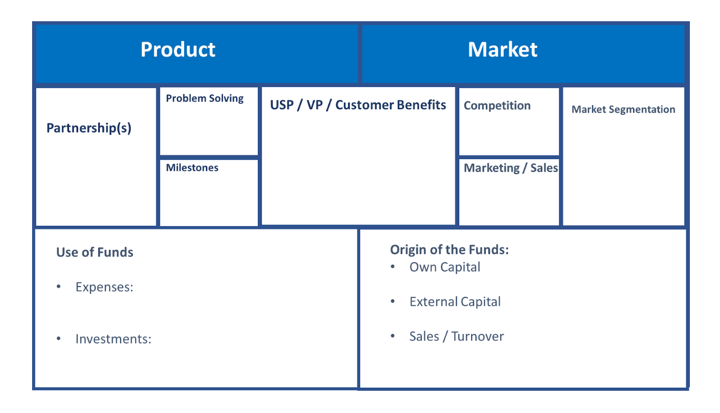 We have slightly adapted the matrix, which is very similar to the original "Business Model Canvas” to support our recommended Businessplan structure and to support the Executive Summary.