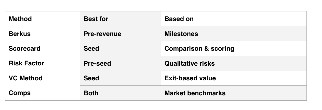 When startups are at pre-seed or seed stage (and often have no revenue yet), traditional valuation methods like discounted cash flow don’t work well. Instead, investors use practical, comparative, or intuitive approaches.